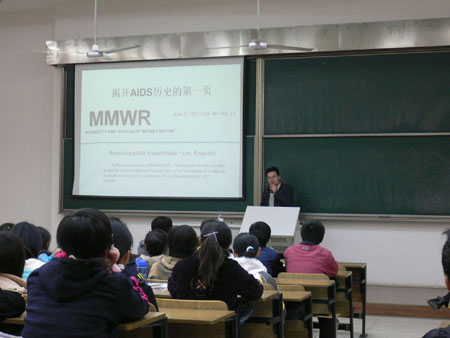 对于艾滋病这一全社会面临的重大卫生问题,羊主任进行了深入的讨论。他首先回顾了全球艾滋病的发现及流行过程,指出人类疾病发展史上从未有过像艾滋病这样的疾病受到全世界如此广泛的关注。他系统讲解了艾滋病的传播途径,全球流行共同模式,同时介绍了各国政府防治艾滋病采取的主要措施。随后通过图表形象直观的介绍了现阶段艾滋病在我国的流行现状、趋势以及防治工作的挑战。他指出,尽管在艾滋病宣传和防治过程中难度比较大,但广大公共卫生工作人员仍坚守阵地,为实现“保持低流行状态”的目标而努力奋斗。羊主任最后呼吁在座的医学生积极学习,树立坚定的专业信念,掌握扎实的医疗知识,为公共卫生事业的发展建功立业。