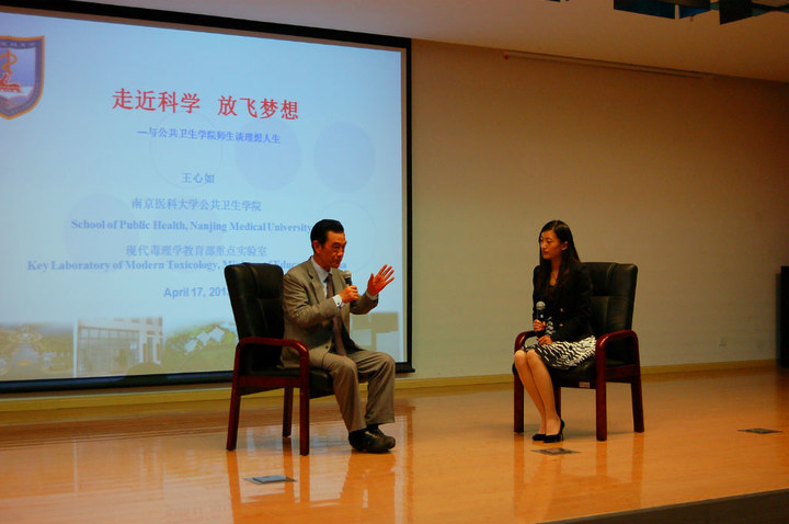 王心如教授一开始就以其特有的诙谐幽默和充满激情的言语让在座的师生耳目一新、掌声雷鸣。他以食品安全、环境安全和生态安全等为例分析了当前社会所面临的严峻形势,要求在座师生从保卫人民健康、保障国家安全的高度来思考公共卫生事业这一重大课题,重任在肩,希望我们勇于挑战。接着,他介绍了大学理念,大学功能,大学真谛,大学文化,阐述了科学的“求真”,人文的“求善”,两者结合的“求美”,真诚地希望同学们不仅要了解研究公共卫生的目的和意义,还要明德亲民,止于至善,并激励同学们要励精图治,争做上医,治未治之病。王心如教授作为现代公卫学院的倡导者和践行者,在简要介绍了我院的历史沿革,发展进程,办学特色,学科建设和科学研究等方面的内容的基础上,与同学们分享了许多国内外著名院校和企业的优秀精神和卓越理念,如硅谷理念“只有第一,没有第二”,清华校训“自强不息,厚德载物”等,并强调我院的院训精神,希望同学们博学、诚信、笃行、创业,鼓励大家要敢于放飞梦想,努力成长为创造性、开放性、复合性的人才,为社会、为国家作出贡献。最后,王心如教授将“4Learn”作为结束,他希望师生们Learn to learn,learn to do,learn to together,learn to be。王心如教授妙语连珠,声情并茂,使得全场气氛热烈,掌声不断,同学们也激情响应。在师生互动环节中,现场气氛更是热烈,王心如教授就同学们提出的如幸福感、梦想、研究生应该具备的素质和要求等问题,都做出了耐心、智慧而又真诚的解答,精彩之处博得在场师生阵阵掌声。