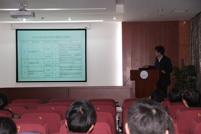 2015年1月13日上午,公共卫生学院中层管理干部换届选聘工作会在205会议室召开,学系(中心)主任、副主任、秘书、副高以上教师、机关科以上干部参加了会议,陈峰院长对本轮学系、中心机构设置的调整与选聘进行了意见征询与说明,施爱民书记对推荐自荐进行了动员。