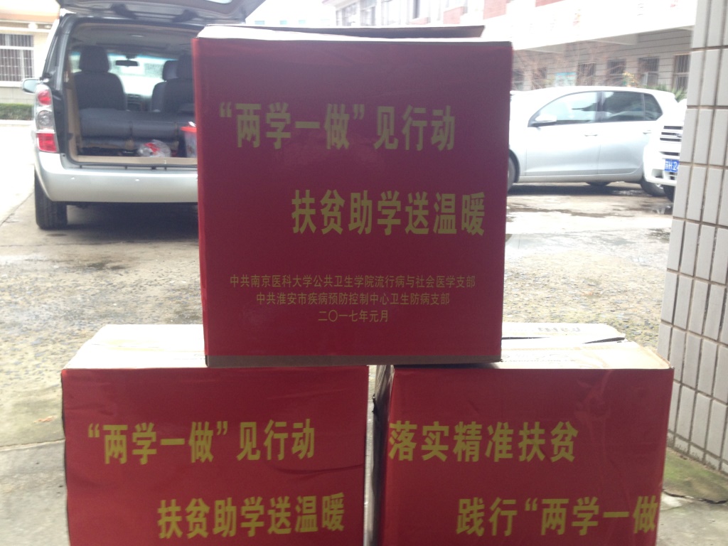 公共卫生学院流行病社会党支部在践行“两学一做”中,与淮安市疾控中心卫生防病党支部联合开展了一次扶贫助学活动。1月7日上午,承载着流行病社医党支部爱心的慰问品,在冬日寒雨中,由受委托的淮安市疾控中心卫生防病支部送达了盱眙县官滩镇霍山村,这个当地卫生计生系统扶贫点。