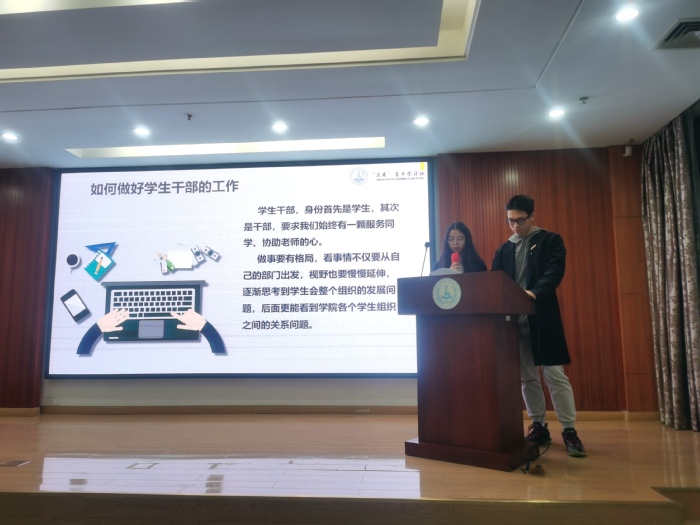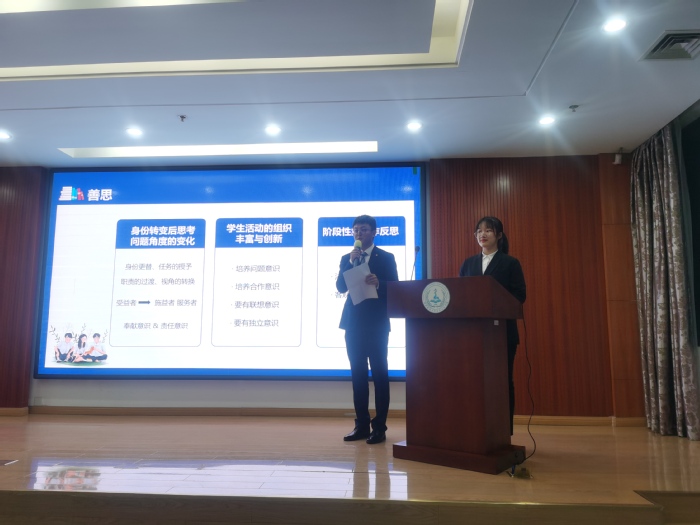 经过两周以来的菁英训练营学习和素质拓展,8组学员代表根据抽签顺序依次上台汇报了学习心得和体会,成为一名合格的学生干部要善于学习,勤于思考,勇于实践,敢于创新,在行动中践行初心和引领同辈群体共同进步。