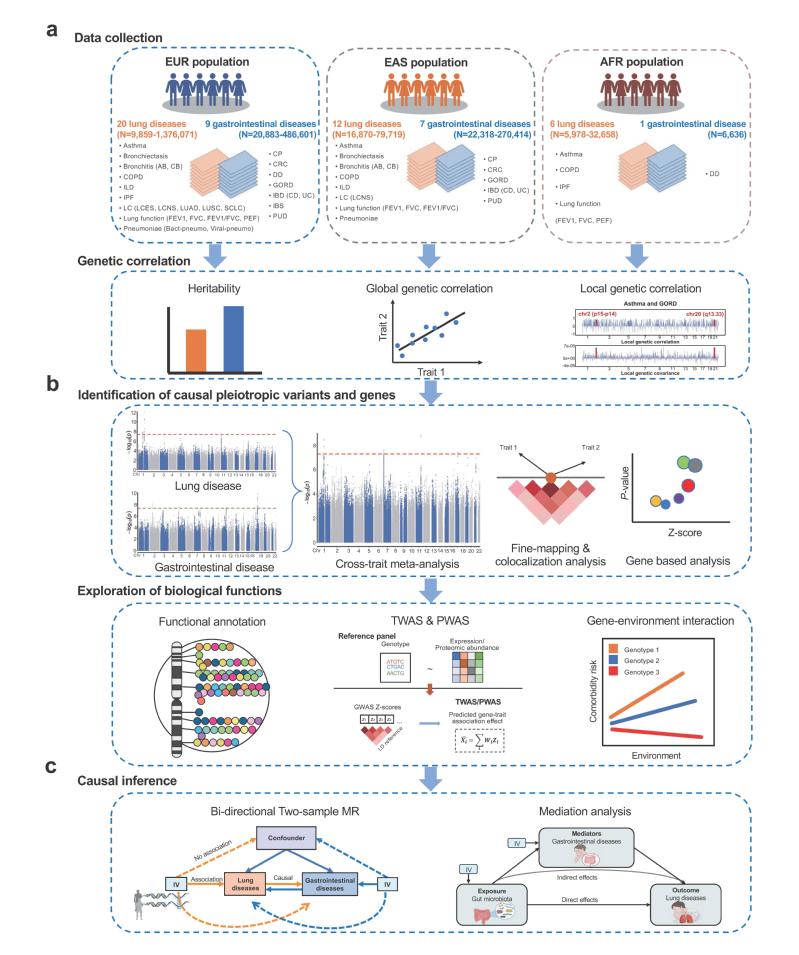 肺部与胃肠道疾病常呈共病状态,显著影响患者健康结局。近年来,GLA概念的提出强调了肠道菌群、免疫细胞及炎症因子在两类疾病互作中的关键作用。尽管已有研究证实环境因素(如吸烟)可通过GLA影响疾病风险,但关于其遗传机制的系统性研究仍属空白。