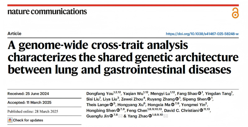 2025年5月,公共卫生学院赵杨教授课题组在国际权威期刊《自然·通讯》(Nature Communications)发表题为《全基因组交叉性状分析表征肺部和胃肠道疾病之间的共同遗传结构》(A genome-wide cross-trait analysis characterizes the shared genetic architecture between lung and gastrointestinal diseases)的研究论文。该研究基于大规模的全基因组关联研究(GWAS)数据,系统解析了肺部与胃肠道疾病共病的遗传机制,识别出多效性遗传位点(SNP)、关键基因及相关生物学通路,为理解“肠-肺轴(gut-lung axis, GLA)”提供了多组学证据。