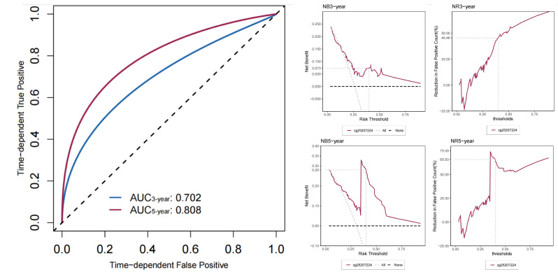 ③在临床转化方面,决策曲线分析表明,临床应用cg25207224HMGA1位点作为无创的唾液检测标志物以观测HNSCC预后具有一定的临床收益和转化价值。