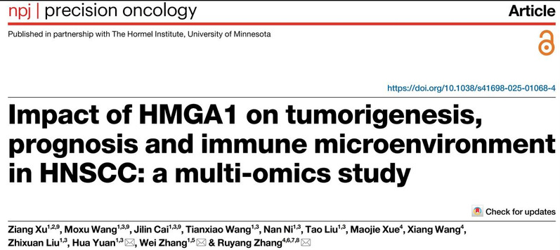 2025年8月,生物统计学系张汝阳教授团队在《Nature》合作期刊《npj Precision Oncology》(中科院1区、南医大高水平4类期刊)发表题为“Impact of HMGA1 on tumorigenesis, prognosis and immune microenvironment in HNSCC: a multi-omics study”的研究论文。该研究采用“干湿结合”的研究策略,从基因组学、表观遗传组学、转录组学、蛋白组学等层面探讨了HMGA1在头颈部鳞状细胞癌(head and neck squamous cell carcinoma, HNSCC)肿瘤发生、预后和免疫微环境中的作用模式。