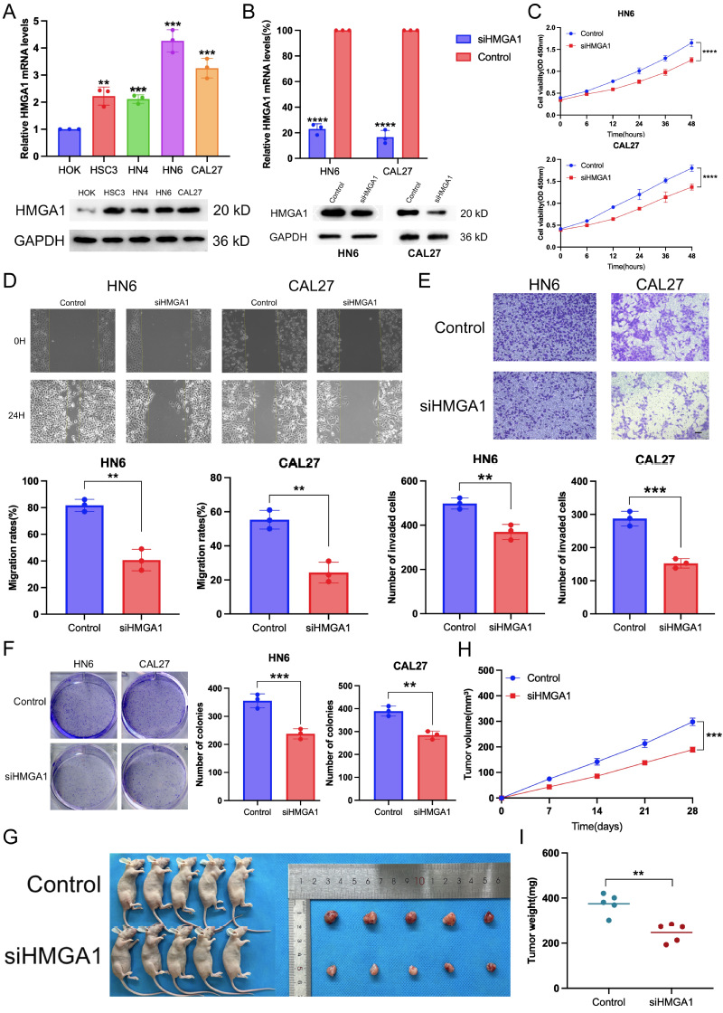 ②在功能验证方面,通过体内、体外实验确认了HMGA1作为促癌基因在HNSCC发生发展,迁移,增殖及耐药等方面的作用。