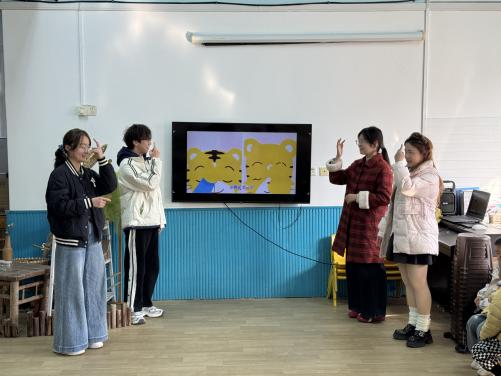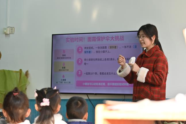 为让枯燥的护肤知识更易被幼儿接受,团队设计了多形式互动环节。“特别导师”巧虎的护肤小舞蹈登场后,孩子们跟着屏幕演示与大学生哥哥姐姐的示范,认真模仿“蘸取面霜”“轻抹脸颊”等动作,在欢快律动中记住护肤基础步骤。