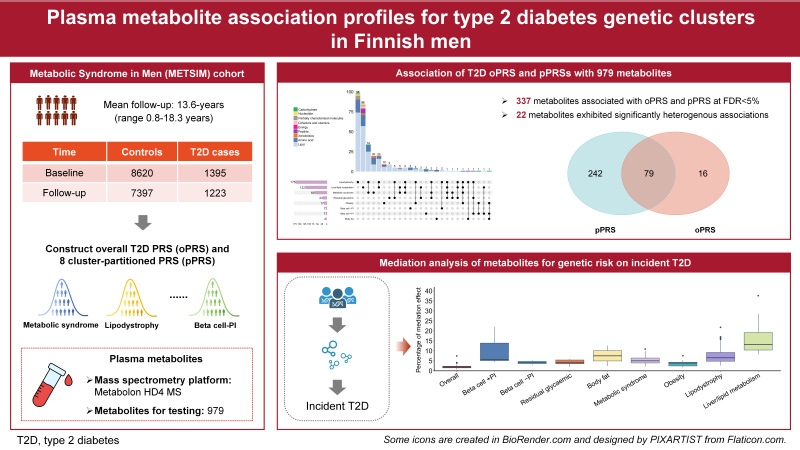 2型糖尿病是一种高度异质性的慢性代谢性疾病,其发病机制涉及多种生物学通路。近期研究通过整合2型糖尿病相关遗传变异与37种心血管代谢性状的关联,将遗传变异划分为八个具有不同病理生理特征的亚型。然而,这些遗传亚型的特异性代谢特征,以及各亚型相关代谢物如何介导遗传风险尚不明确。