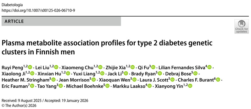 3月18日,我院流行病学系尹先勇教授团队联合美国密歇根大学Michael Boehnke教授团队、东芬兰大学Markku Laakso教授团队等,在国际期刊《糖尿病学》(Diabetologia)发表题为“芬兰男性2型糖尿病遗传亚群的血浆代谢物关联特征(Plasma metabolite association profiles for type 2 diabetes genetic clusters in Finnish men)”的研究论文。该研究基于大规模人群队列,首次系统描绘了2型糖尿病8种遗传亚型所对应的血浆代谢物图谱,揭示了不同遗传机制驱动下的疾病代谢异质性,并发现大量代谢物在遗传风险向疾病转化过程中的潜在中介作用,为未来实现精准分型与个体化干预提供重要科学依据。