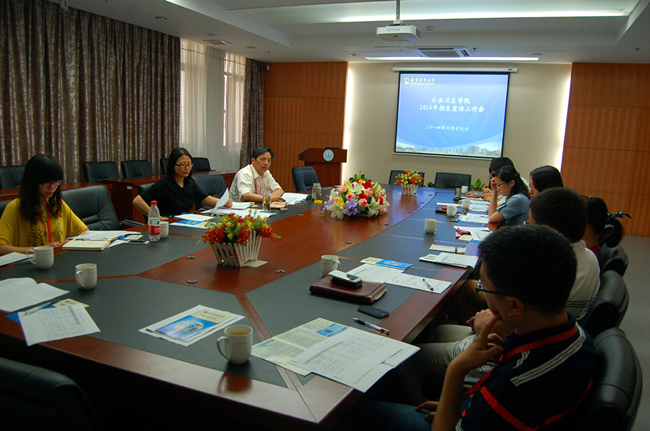 学工办毛曦老师首先传达了校2014年招生宣传工作要点,详细介绍了2014年我校的招生计划、录取原则、激励政策、体检要求,以及往年的录取分数线等。