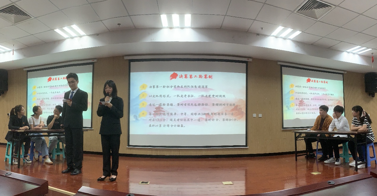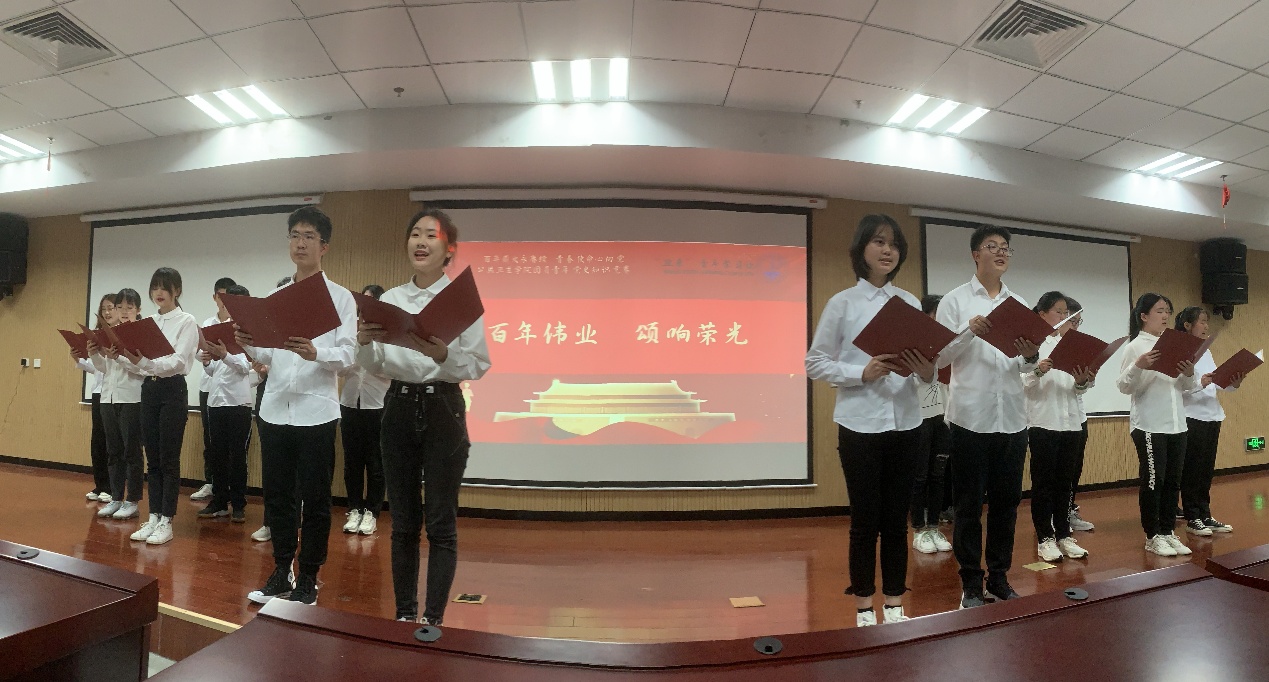 经过前期线上初赛、线下复赛两个环节,共有18名同学进入到现场决赛阶段。此次现场决赛由三个篇章、两轮比赛构成。第一篇章“百年辉煌 唱响弘章”,团员青年代表齐声高歌《天耀中华》,充分彰显了新时代新青年的拳拳爱国心和殷殷赤子情。第二篇章“百年征程 思顾峥嵘”,18名同学分为六组展开激烈角逐,在比赛中,同学们“重走长征路”、“重温百年史”,在学习掌握基本党史知识的同时,再次深切感知和体悟党百年历程中的伟大成就,自觉传承和发扬党百年征途中的伟大精神,从历史中汲取智慧和力量。第三篇章“百年伟业 颂响荣光”,团员青年代表深情诵读《百年风雨路》,以青春的告白献礼建党百年。经过两轮角逐,最终产生一等奖3名同学,二等奖6名同学,三等奖9名同学。