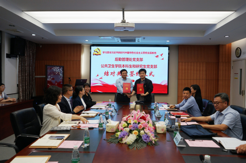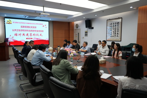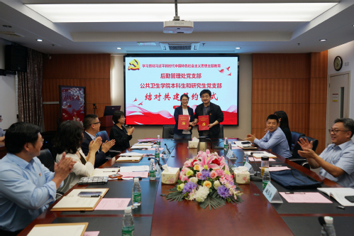 为深入学习贯彻习近平新时代中国特色社会主义思想,创新基层党建工作载体,推进主题教育走深走实, 6月5日下午,后勤管理处党支部与我院本研学生党支部举办党支部结对共建签约仪式和“牢记嘱托、感恩奋进、走在前列”大讨论联学活动。后勤管理处处长谢健、副处长徐平,学院党委书记盛彤彤,以及后勤管理处党支部、公共卫生学院本科生和研究生党支部相关老师和党员代表参加了活动。活动由学院副书记毛曦主持。