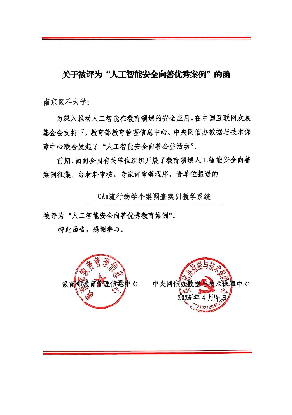 为深入推动人工智能在教育领域的安全应用,教育部教育管理信息中心、中央网信办数据与技术保障中心联合发起了“人工智能安全向善公益活动”,面向全国有关单位组织开展了教育领域人工智能安全向善案例征集。经材料审核、专家评审等程序,近日教育部教育管理信息中心、中央网信办数据与技术保障中心联合发函,我院报送的教学案例《CAs流行病学个案调查实训教学系统》被评为全国教育领域“人工智能安全向善优秀案例”,这是学院在AI赋能预防医学人才培养与创新应用上的成功探索。